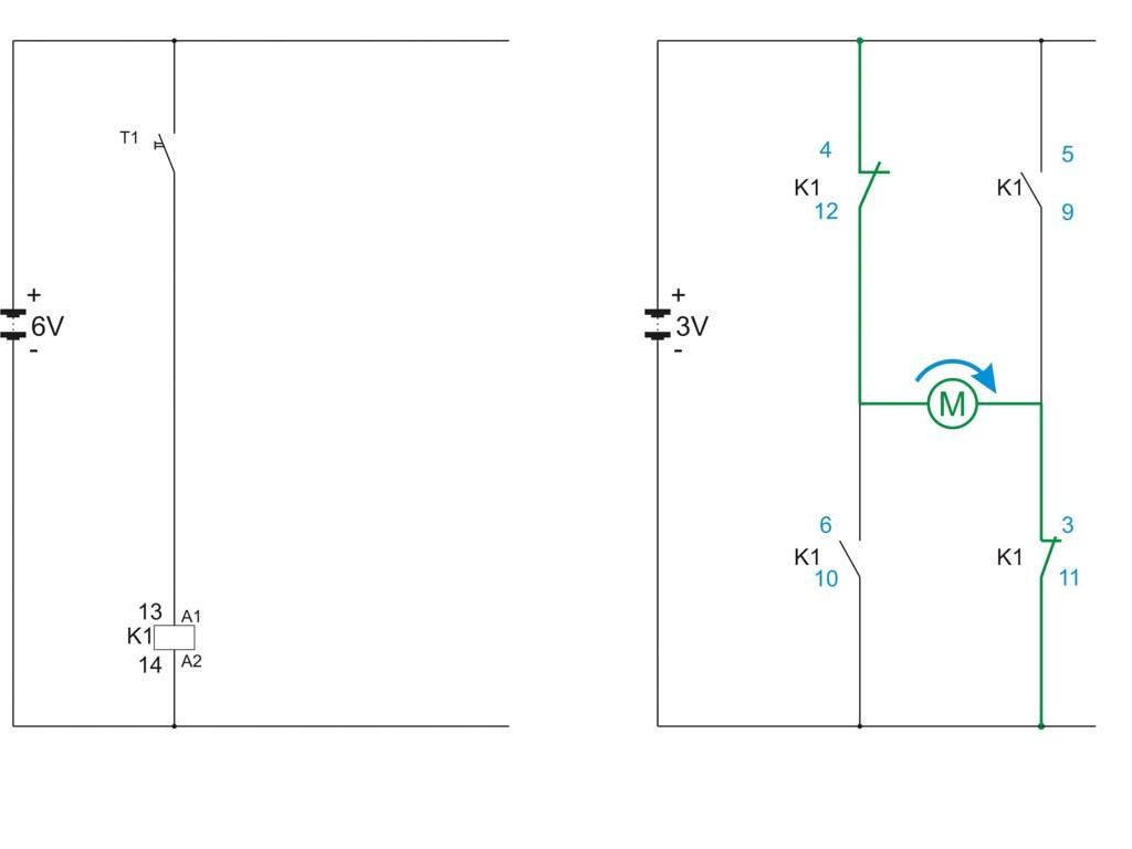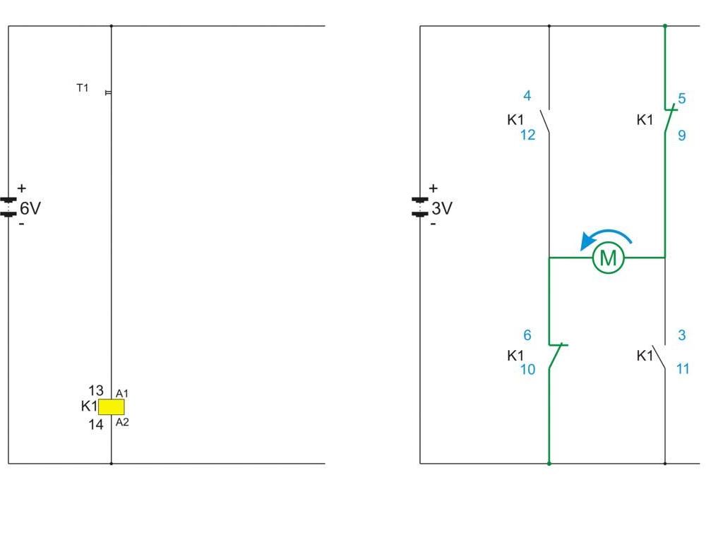 Wie bereits erwähnt, besteht eine H-Brücke aus vier Schaltern, die jeweils mit einer Öffner- und Schließerfunktion ausgestattet sind. Diese werden daher als Wechsler bezeichnet. Diese Wechsler müssen nun derart verschaltet werden, dass bei einem Wechsel ihrer Stellung jeweils die Anschlüsse für den Elektromotor von Plus nach Minus hin- und herwechseln. Eine derartige Schaltung sieht, realisiert mit einem Relais, wie rechts dargestellt aus.
