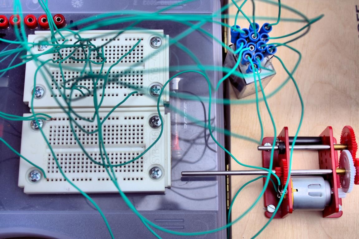 Ein nachfolgender Testaufbau bestätigt, dass diese Schaltung korrekt funktioniert und beim Drücken des Tasters T1 der Elektromotor seine Laufrichtung wechselt, was im simulierten Schaltplan dargestellt wird.