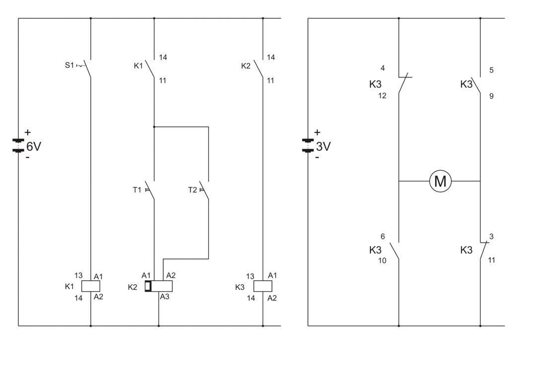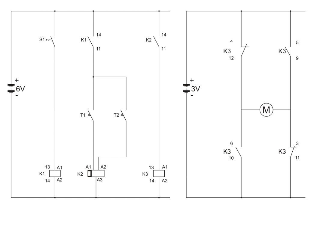 Die Änderung der Drehrichtung eines Elektromotors kann beim Einsatz der Relaistechnik über eine sogenannte H-Brücke realisiert werden. Ein bistabiles Relais sorgt dafür, dass diese H-Brücke sofort umschaltet, wenn der Aktor eine Endstellung erreicht hat. Die dazu nötige Abfrage wird von Sensoren gemeldet, die in der einfachsten Variante als mechanisch betätigte Schalter ausgeführt sind. Dies können für einen ersten Versuchsaufbau durchaus auch von Hand betätigte Taster sein, um die korrekte Funktion einer Musterschaltung zu überprüfen.