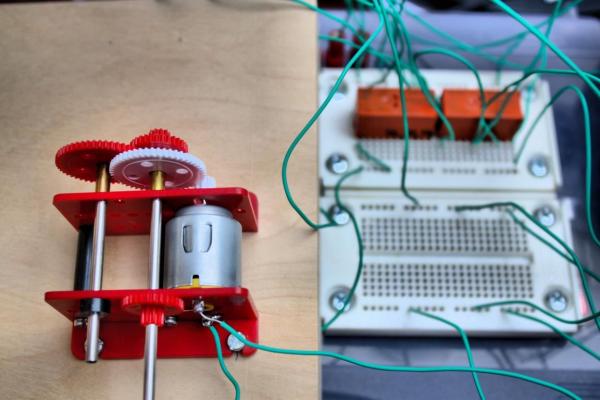 Wenn die Verdrahtung korrekt vorgenommen wurde, dreht sich der Gleichstrommotor rechts- beziehungsweise linksherum. Die Drehrichtung wird durch Betätigen der Taster T1 und T2 jeweils geändert.