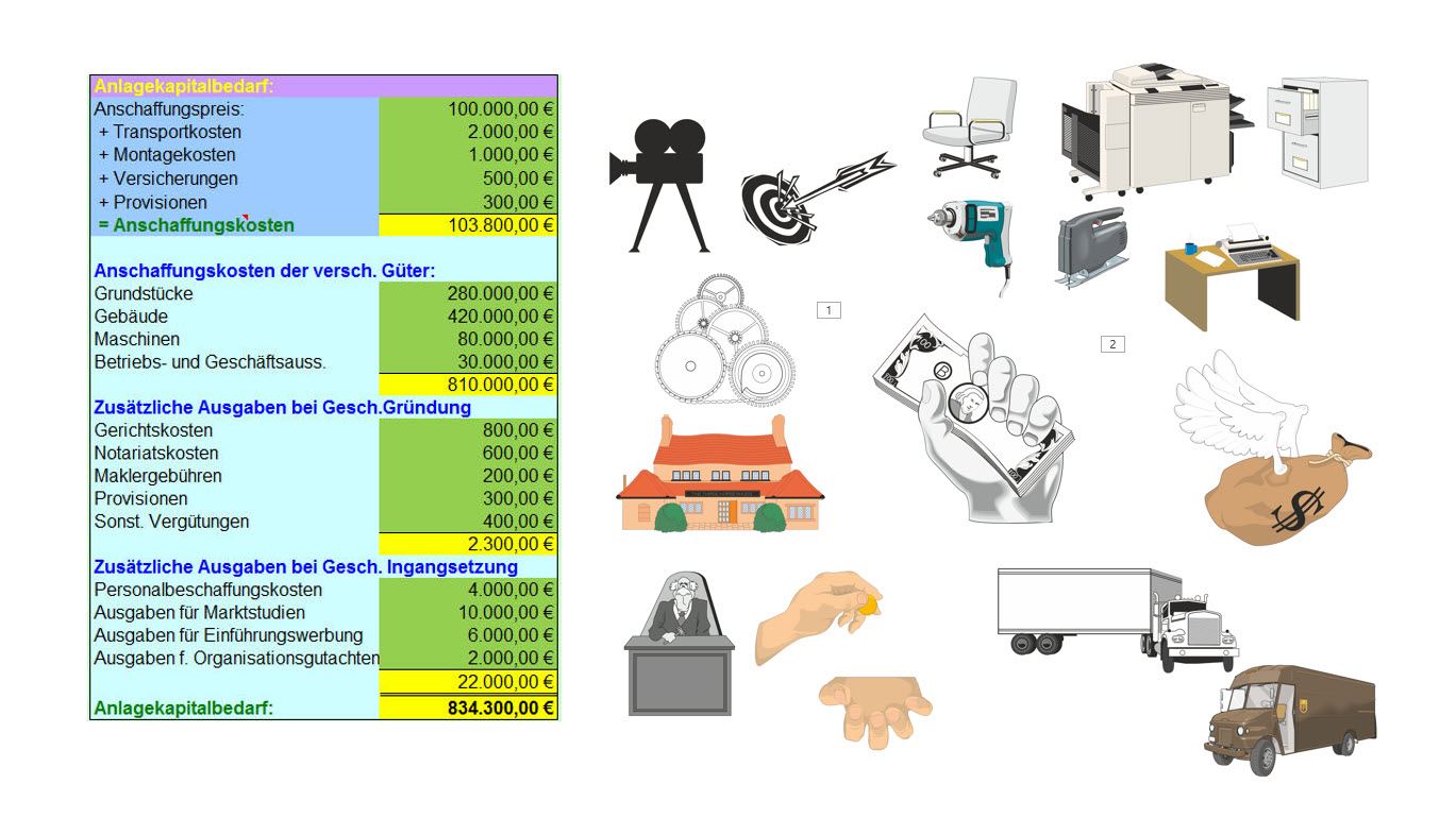 Um den Anlagenkapitalbedarf zu ermitteln, sind die Anschaffungskosten der benötigten Anlagegüter zu ermitteln. Zum Anschaffungspreis für Maschinen, Grundstücke, Gebäude und Betriebsausstattungen gehören natürlich auch die Transport- und Montagekosten, Versicherungen und Provisionen sowie Gerichts- und Notarkosten.