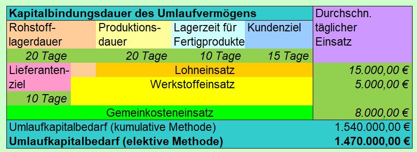 Zum Anlagenkapitalbedarf gesellt sich der Umlaufkapitalbedarf. Das Umlaufkapital stellt die Durchführung des Leistungsprozesses sicher. Dieser Bedarf wird aus der Kapitalbindungsdauer des Umlaufvermögens sowie den durchschnittlichen täglichen Auszahlungen ermittelt. Dazu wird entweder die kumulative oder die elektive Methode herangezogen. Bevorzugt wird die elektive Methode eingesetzt, da diese den Kapitalbedarf genauer ermittelt.