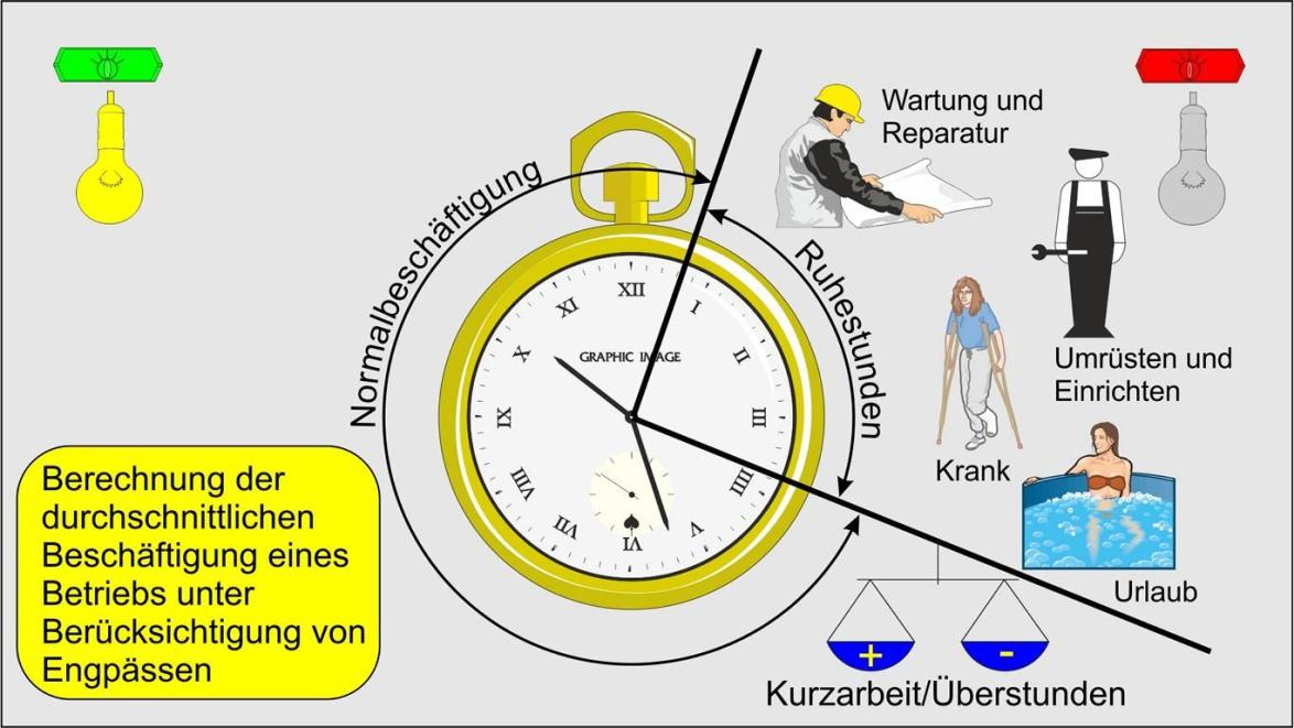 Der Einsatz von Maschinen wird in der Regel so geplant, dass die Zahl der Ruhestunden minimal ist. Von der maximal zur Verfügung stehenden Zeit sind diejenigen Zeiten abzuziehen, in denen die Maschine stillsteht. Dazu zählen Wartungs- und Reparaturzeiten, Umrüst- und Einrichtezeiten sowie die Zeiten, in denen die Maschine nicht bedient wird, da das Personal in Urlaub oder erkrankt ist. Das Ergebnis dieser Überlegungen ist die sogenannte Normalbeschäftigung [6], die durch Überstunden oder Kurzarbeit positiv oder negativ beeinflusst wird.