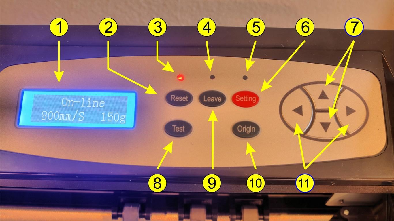9 Leave-Button: Der „Leave“-Button dient dazu, den Plotter aus dem Online-Modus (in dem er Daten vom Computer empfängt) in einen Offline-Modus zu versetzen. Dieser Button kann genutzt werden, um den Plotter anzuhalten, damit nach einem Test-Schnitt die Position des Nullpunkts geändert werden kann, ohne den gesamten Auftrag abzubrechen.