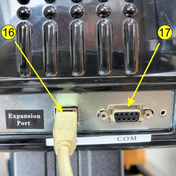 Der Plotter SK720A besitzt eine USB- (16) sowie eine serielle Schnittstelle (17). Da die USB-Schnittstelle einfacher zu konfigurieren ist beziehungsweise diese automatisch erfolgt, empfiehlt es sich, diese zur Kopplung des Plotters an den PC zu verwenden.