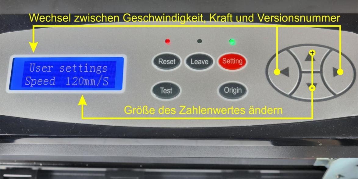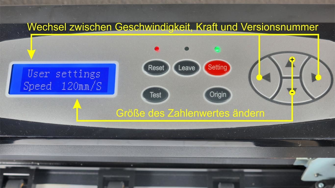 Mit den Tasten 11 kann zwischen Geschwindigkeit und Kraft gewechselt werden. Zudem ist es möglich, sich die Versionsnummer der Plotter-Software anzeigen zu lassen.
