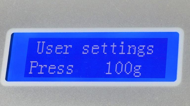 Über die Tasten 7 wird die Größe des Werts bestimmt. Dabei wird über die Taste „Auf“ der Wert erhöht, wohingegen dieser über die Taste „Ab“ verringert wird. Die Schnittkraft kann in einem Bereich von 10 g bis 500 g eingestellt werden, während für die Geschwindigkeit Werte im Bereich von 20 bis 800 Millimeter pro Sekunde einstellbar sind.