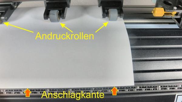 Damit das Papier beziehungsweise die Folie sauber geführt wird und während der Bearbeitung nicht verrutscht, müssen die Andruckrollen mit einer gewissen Kraft auf das zu bewegende Medium einwirken. Diese Kraft wird durch Umlegen der hinten befindlichen Hebel in eine waagrechte Stellung aufgebracht.