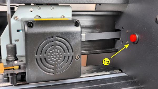 Nachdem der Plotter über den Netzschalter eingeschaltet wurde, fährt der Stifthalter automatisch in die Endlage des Schlittens. Dort befindet sich ein Schalter (15), der vom Stifthalter bei seiner Endlagenfahrt zwangsweise betätigt wird. Dies hat zur Folge, dass der Stifthalter seine Bewegung umgehend stoppt und diese Position vom Controller des Plotters als Startposition abspeichert wird.