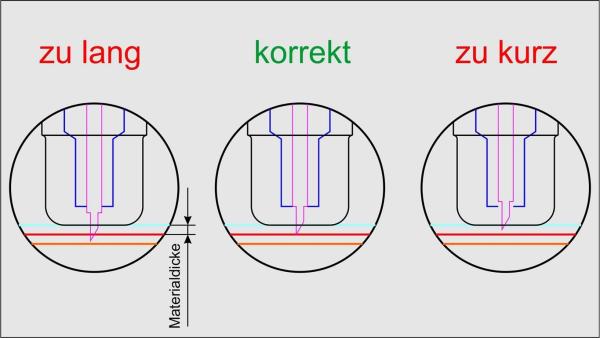 Die richtige Länge der aus dem Halter ragenden Klingenspitze ist entscheidend für das Schneidergebnis. Ragt das Messer zu weit aus dem Adapter oder ist es zu tief in diesem versteckt, so muss eine Längenkorrektur der Spindel vorgenommen werden. Dabei ist zu beachten, dass das Messer um die Hälfte der Materialdicke aus dem Adapter herausragt. Anderenfalls wird das Material nicht durchgeschnitten beziehungsweise wird das Messer durch zu großer Auskragung von der Auflage des Plotters beschädigt.