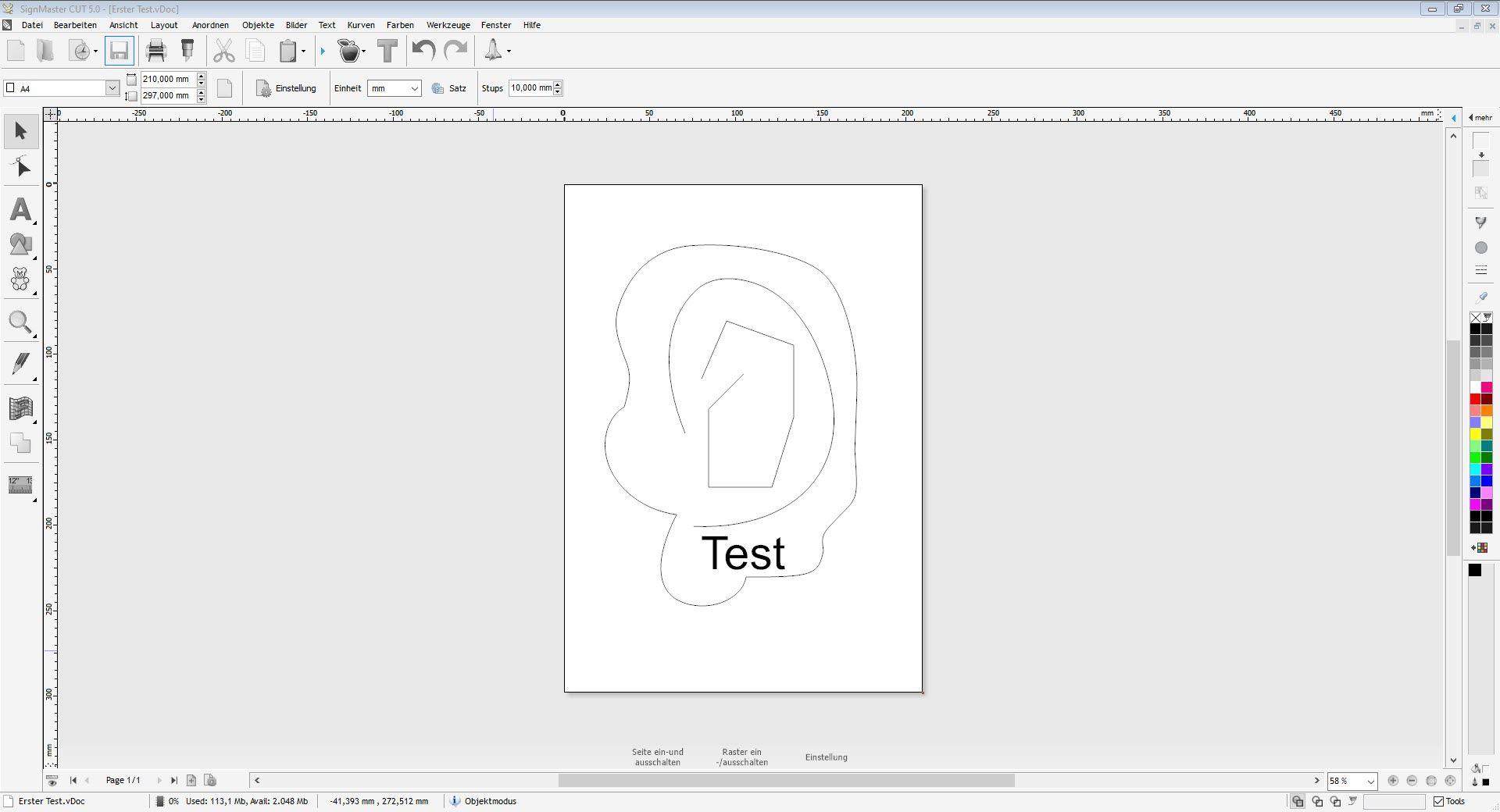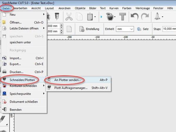 Mit dem Plotter wird das Programm SignMaster mitgelieferte, das es erlaubt, Grafiken anzufertigen und diese an den Plotter zu senden. Für einen ersten Testdruck wird ein neues Dokument angelegt und werden wahllos einige Elemente, wie Geraden, Kurven und Text erzeugt.