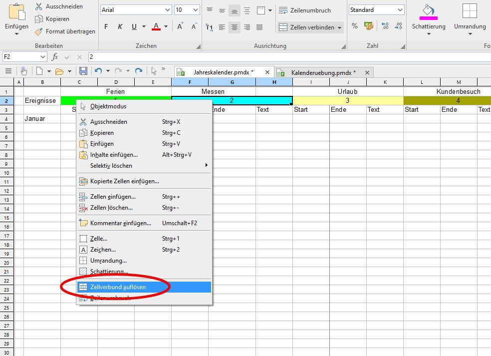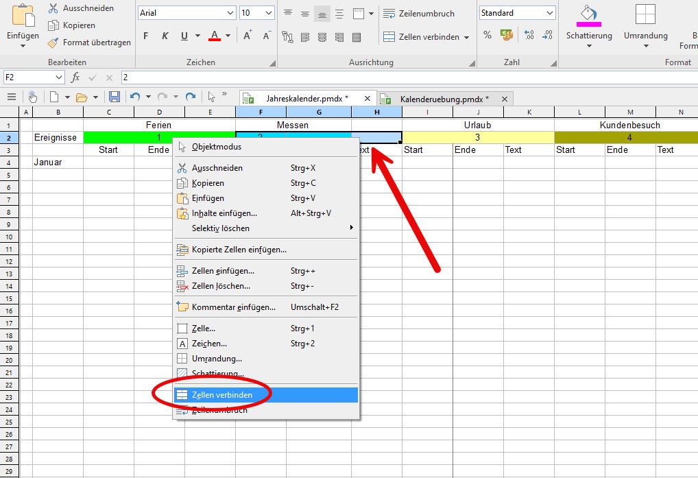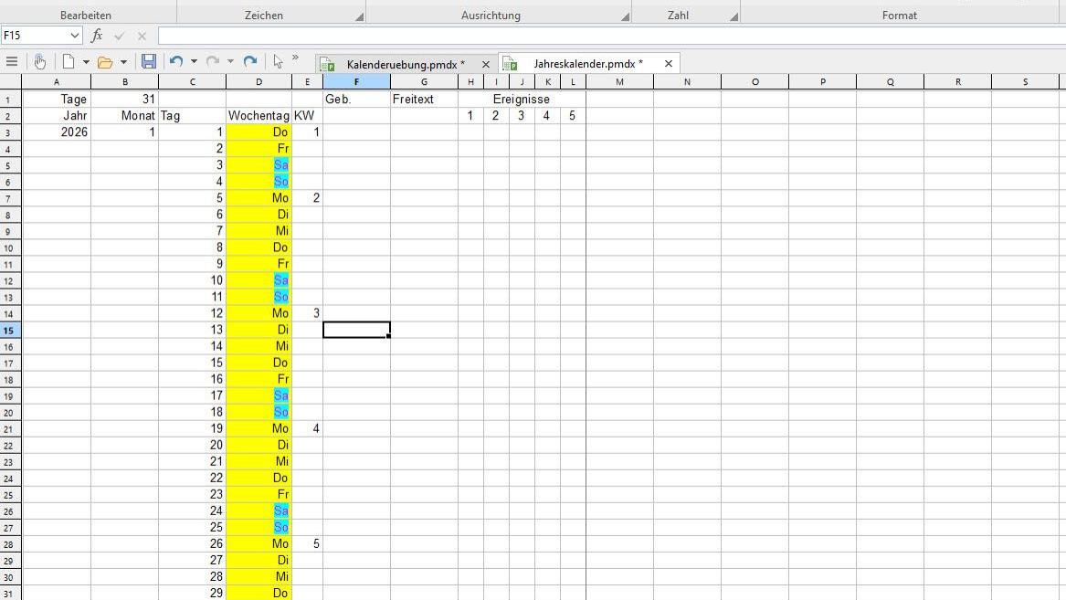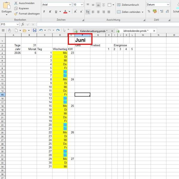 In einem Kalender möchte man den Monat auf einen Blick erfassen und nicht nur eine Zahl präsentiert bekommen. Dies ist problemlos möglich, da in Planmaker auch dafür eine hilfreiche Funktion existiert: =TEXT(DATUM(A4;B4;1);"MMMM").
