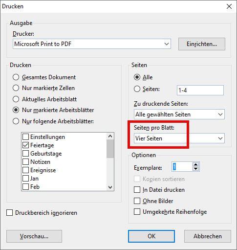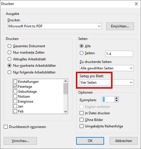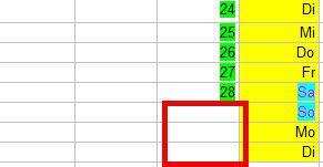 Dadurch kann beispielsweise der Kalender für den Februar entsprechen gekürzt werden, wenn die entsprechenden Zellen passend formatiert werden, wozu sich beispielsweise weißer Text vor weißem Hintergrund anbietet.