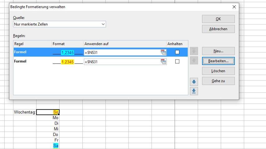 Werden Regeln auf die Wochentage gelegt, so können mit dem Eintrag =WOCHENTAG($N31)=1 der Sonntag und mit =WOCHENTAG($N31)=7 der Samstag farblich unterschiedlich hervorgehoben werden.