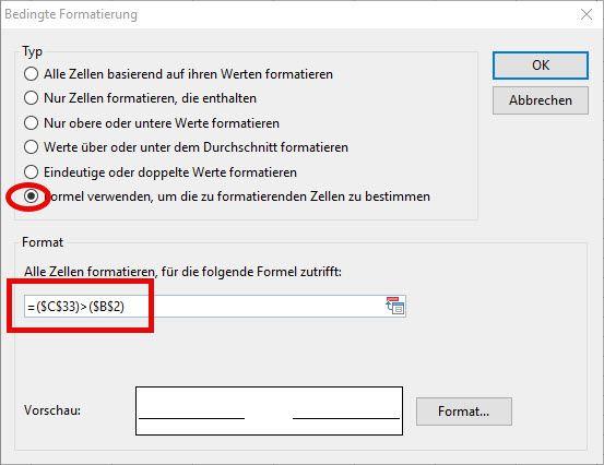 Mit der Formel =($C$33)>($B$2) kann erreicht werden, dass eine Zelle dann formatiert wird, wenn die Zahl in der Zelle C33 größer ist, als die Zahl in Zelle B2.