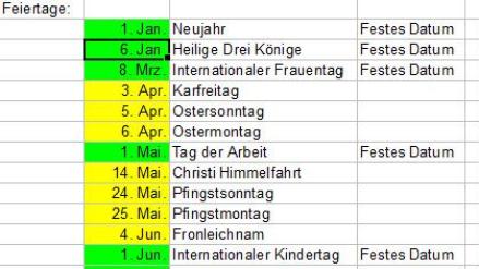 Somit wird mit der Funktion „FEIERTAG(2027;0)“ der Karfreitag im Jahre 2027 berechnet, während mit FEIERTAG(2028;6) das Datum für Fronleichnam im Jahre 2028 berechnet wird.