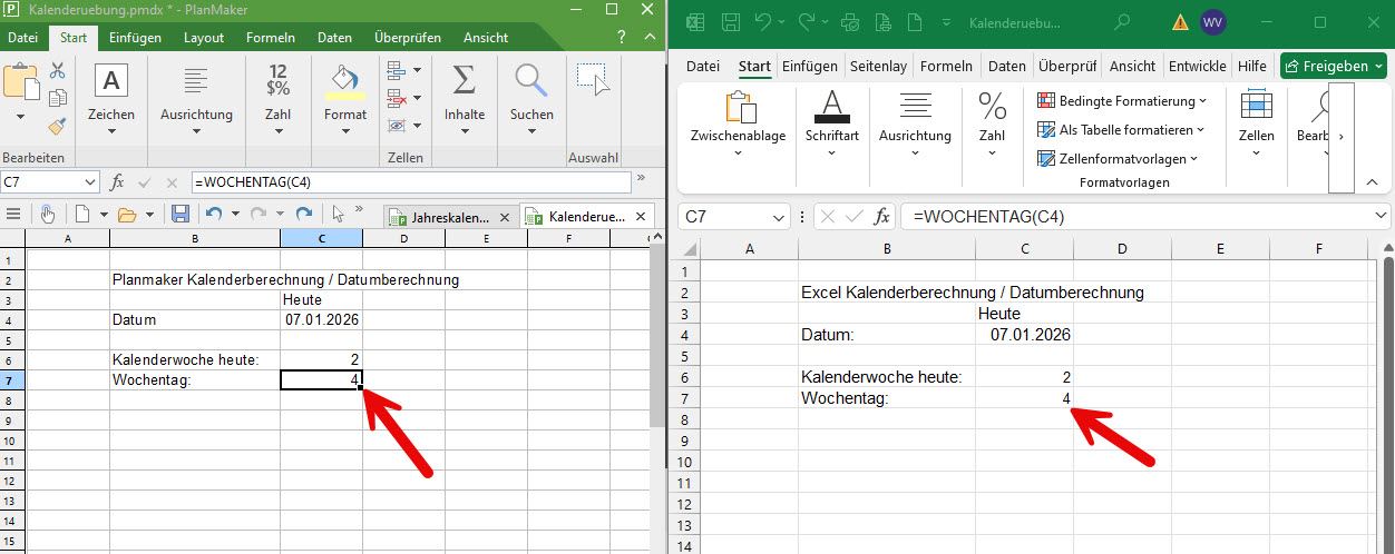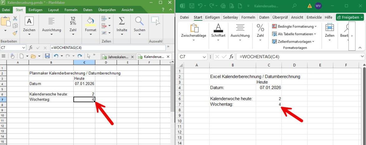 Bei der Ermittlung des Wochentags setzen beide Programme auf die Funktion „=WOCHENTAG(ZELLE)“. Diese liefert allerdings nur eine Zahl zurück, die sich aus dem Sonntag als Starttag der Zählung ergibt. Die Zahl 4 bedeutet demnach, dass es sich beim Datum 7.1.2026 um den Mittwoch handelt, da es inklusive Sonntag vier Tage bis Mittwoch sind.