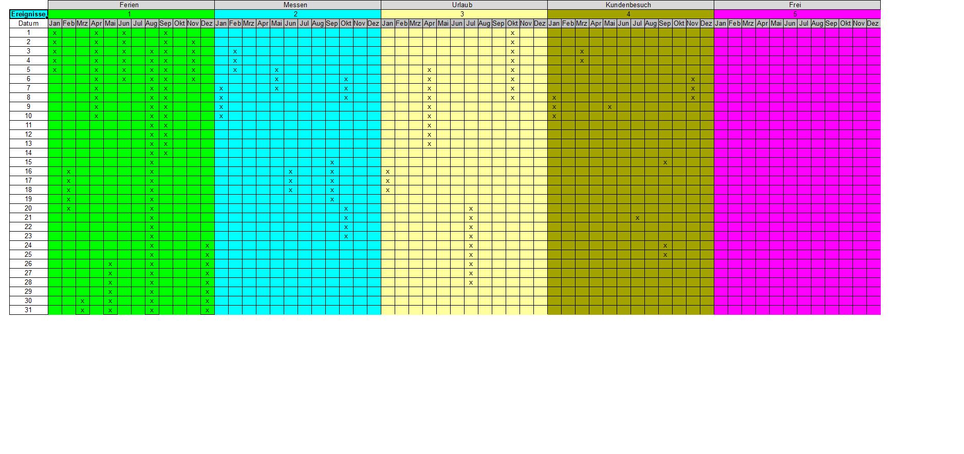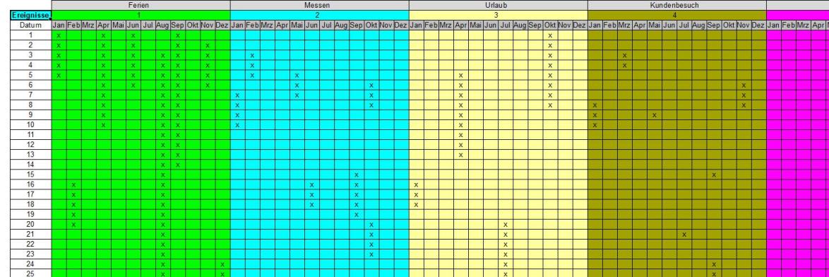Wird ein Kalender beruflich genutzt, so sind dort nicht nur Urlaubszeiten, sondern auch Kunden- oder Messebesuche von Interesse. Die Angaben lassen sich auf ähnlich einfache Weise handhaben, wenn dazu ein eigene Tabellenblatt verwendet wird, wie es auch bei den Geburtstagen Verwendung fand.