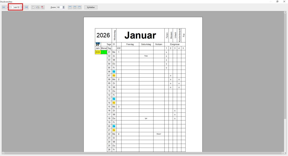 Wird nun der Button „Vorschau…“ angeklickt, so öffnet sich ein Fenster, in dem alle ausgewählten Kalendermonate durchgeblättert werden können.