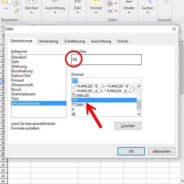 Nun genügt ein Klick auf den Eintrag „TTT“, um die Zelle entsprechend zu formatieren, damit dort künftig anstatt der Zahl der Wochentag angezeigt wird.