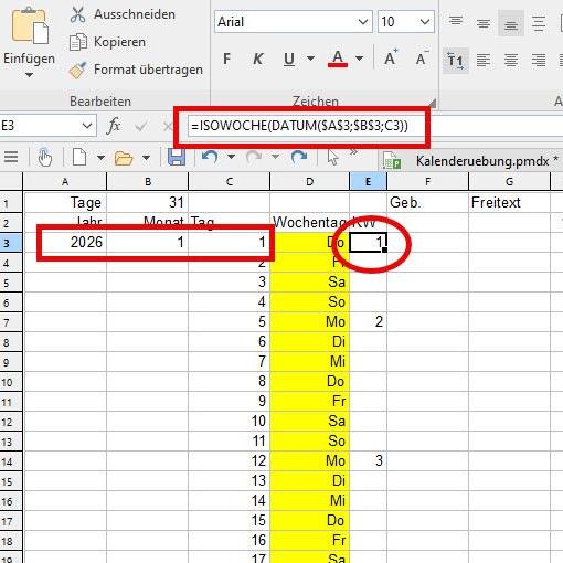 Die Berechnung der Kalenderwoche ist in beiden Programmen auf fast identische Weise möglich: Während in Excel der Befehl „=ISOKALENDERWOCHE(ZELLE)“ verwendet wird, nutzt Planmaker dazu den Befehl „=ISOWOCHE(ZELLE)“, wobei für ZELLE die Position derjenigen Zelle einzutragen ist, die ein Datum enthält.