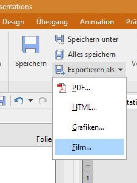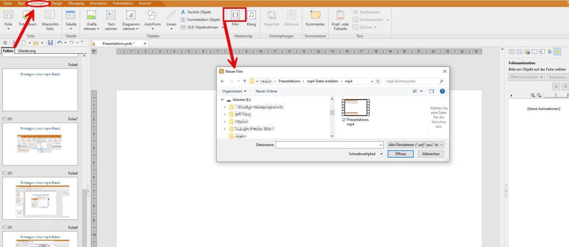 Mit dieser Einstellung kann die Präsentation in ein mp4-Video exportiert werden, was über „Einfügen / Film“ erfolgt.