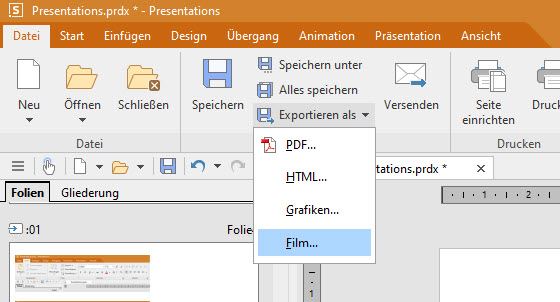 Besonders hervorzuheben ist, dass es mit Presentations möglich ist, aus den erstellten Folien tolle Videos im WMV sowie dem MP4-Format zu produzieren. Dazu muss im Exportieren-Dialog lediglich der Auswahlpunkt „Film…“ gewählt werden, um entsprechende Einstellungen vorzunehmen.