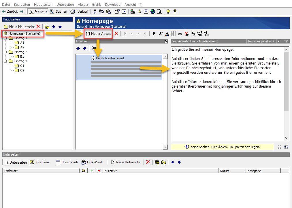 Soll nun auf der Hauptseite ein Text stehen, etwa zur Begrüßung, so muss der Eintrag „Homepage (Startseite)“ angewählt, auf den Button „Neuer Absatz“ geklickt und der Absatz „Text“ ausgewählt werden. In diesen Absatz kann nun der gewünschte Text eingegeben werden, der auf der Homepage-Hauptseite erscheinen soll.