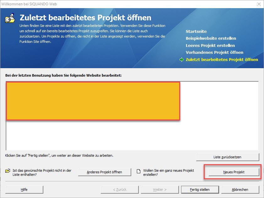 Dazu ist zunächst ein neues Projekt anzulegen, wozu der entsprechende Button betätigt wird, der sich rechts unten im entsprechenden Fenster befindet, welches sich beim Start von „Web“ öffnet.