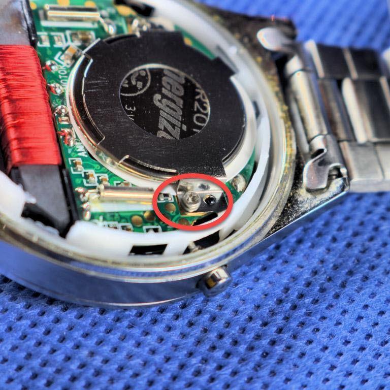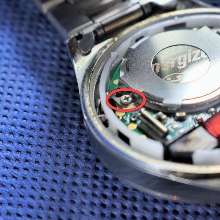 In diesem Beispiel wird die Batterie von einem Ring gehalten, der mit zwei winzigen Schrauben an der Uhrenplatine befestigt ist.