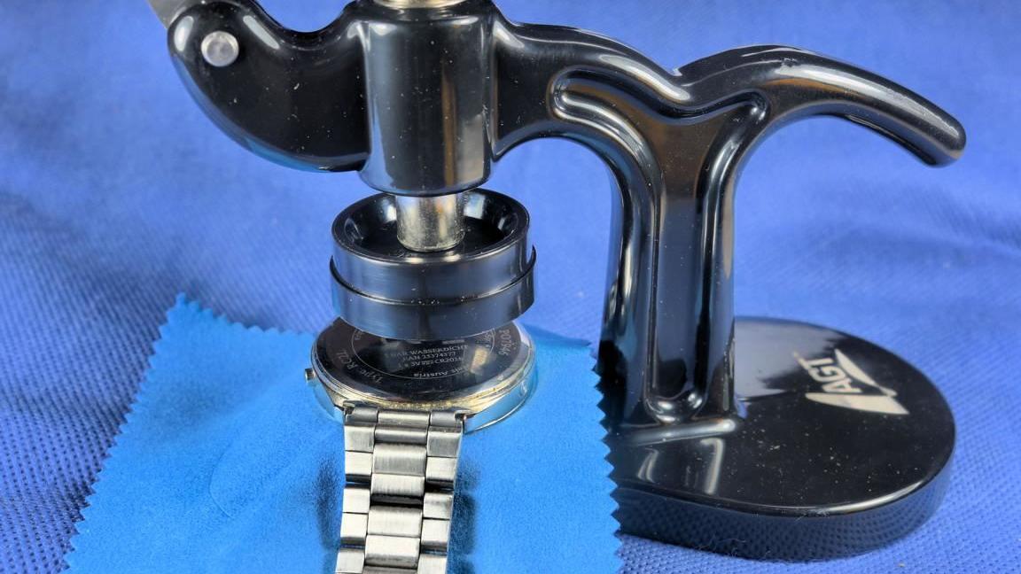 Nach dem Verschrauben des Batteriekäfigs kann der Deckel auf die Uhr aufgelegt und eingepresst werden. Da es nahezu unmöglich ist, mit Muskelkraft die zum Schließen nötige Kraft aufzubringen, muss eine entsprechende Presse verwendet werden, die eigens für diesen Zweck gebaut sind.
