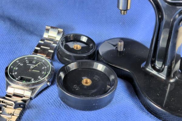 Diese Pressen verfügen über unterschiedlich große Einsätze, die passend zur Uhrengröße ausgewählt werden müssen. Diese verhindern, dass beim Einpressvorgang die Uhr beschädigt wird.
