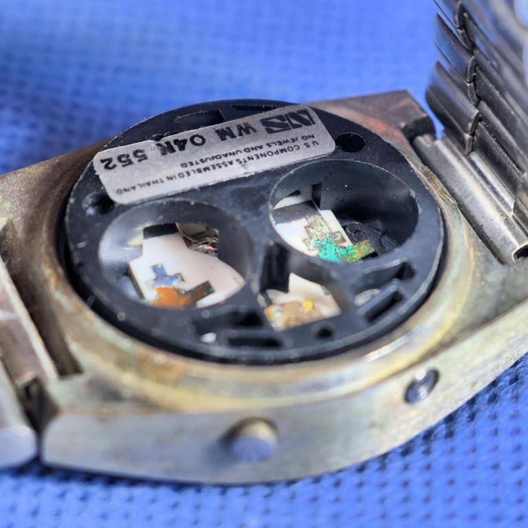 Bei der Entnahme der Batterie darauf achten, dass der umlaufende Dichtungsring nicht entnommen wird, da dessen Wiedereinbau gewisse Hürden birgt. Durch die entnommene Batterie wird der Blick auf die Feder frei, die dafür sorgt, dass die Batterie sicher an den Spannungspolen anliegt. Das weiße Plättchen dient zur Auflage und Isolierung der Batterie und muss unbedingt in der Uhr verbleiben!