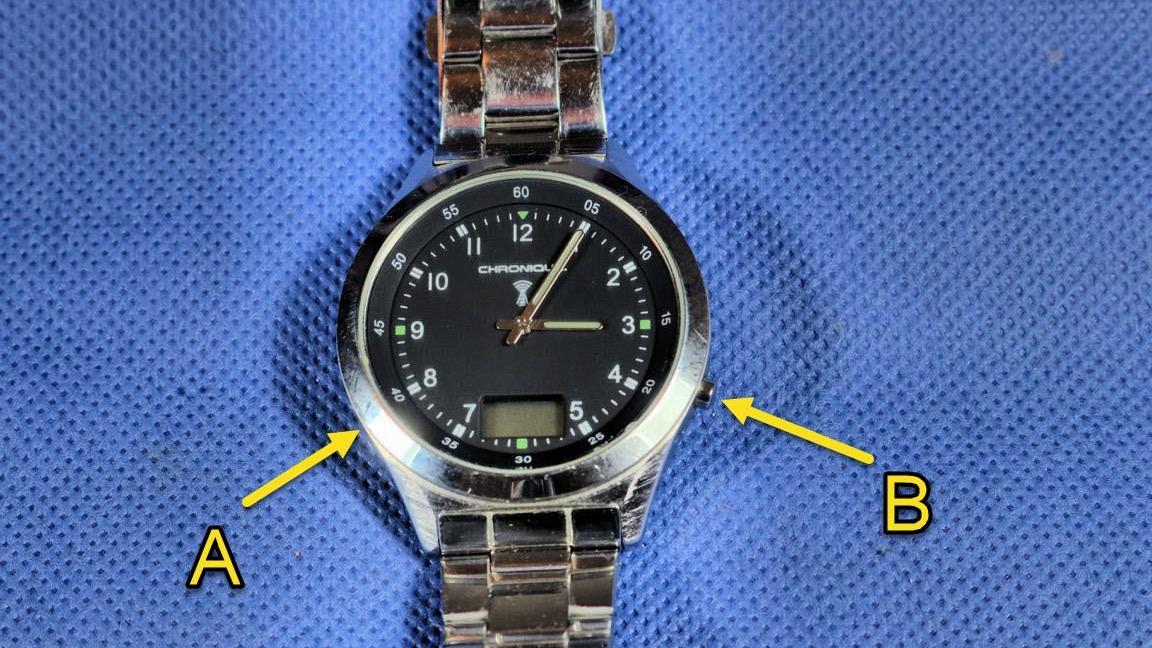 Knopf B ca. 5 Sekunden lang gedrückt halten, wodurch die Zeiger zur 12-Uhr-Position wandern. Die Uhr schaltet nun auf Signalsuche um. Das Funkturm-Symbol neben der Sekundenanzeige blinkt. Sobald ein Funksignal empfangen wird, werden Zeit und Datum angepasst und das Funkturm-Symbol neben der Sekundenanzeige dauerhaft angezeigt.