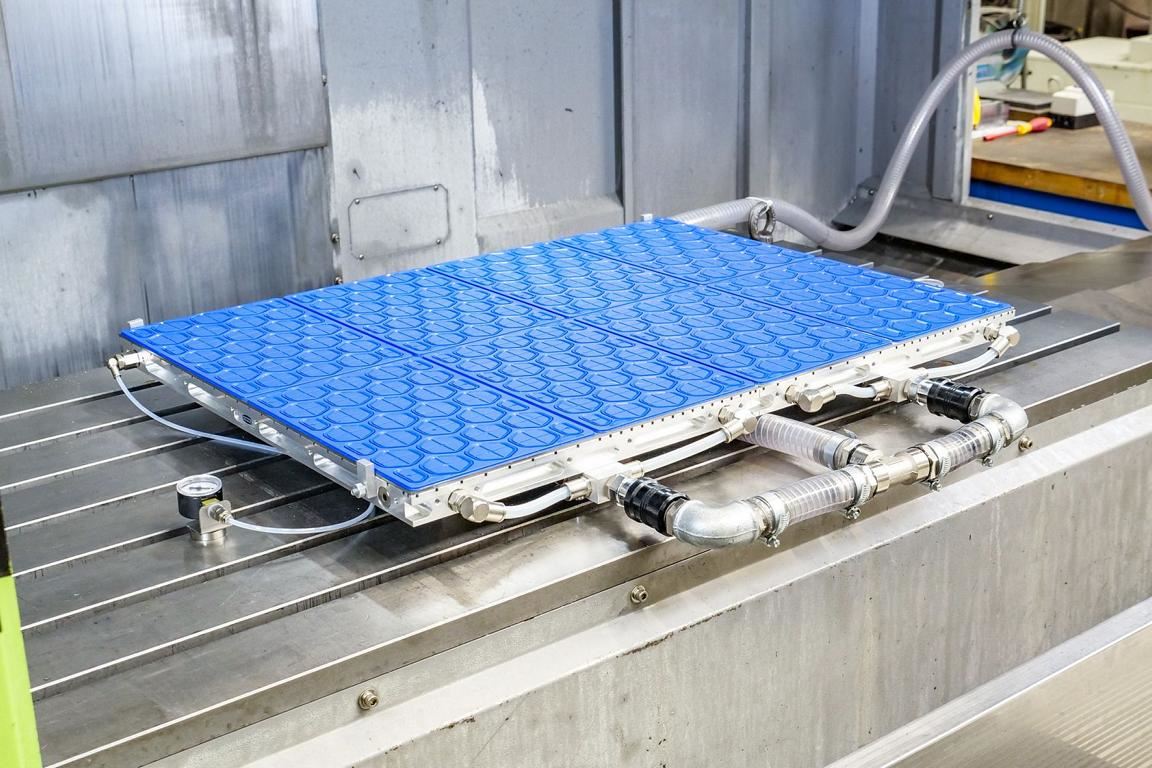 Die Elastomermatte FlexMat SFM fixiert die Kunststoffplatten direkt. Sie erlaubt das Fertigen von Durchbrüchen und auch die Kanten des Werkstücks lassen sich bearbeiten, da die Werkzeuge in die Matte hineinfräsen können. Die FlexMat besitzt auf der Unterseite Noppen, die in die Bohrungen der Innospann Steel-Plate greifen und den sicheren Sitz garantieren. Das ebenfalls auf der Unterseite befindliche Raster leitet das Vakuum in die insgesamt 32 separaten Saugzellen nach oben. Die Matte ist als Verschleißartikel konzipiert, um vielfältige Bearbeitungen zu ermöglichen. Bleibt sie unbeschädigt, lässt sie sich mehrfach wiederverwenden.