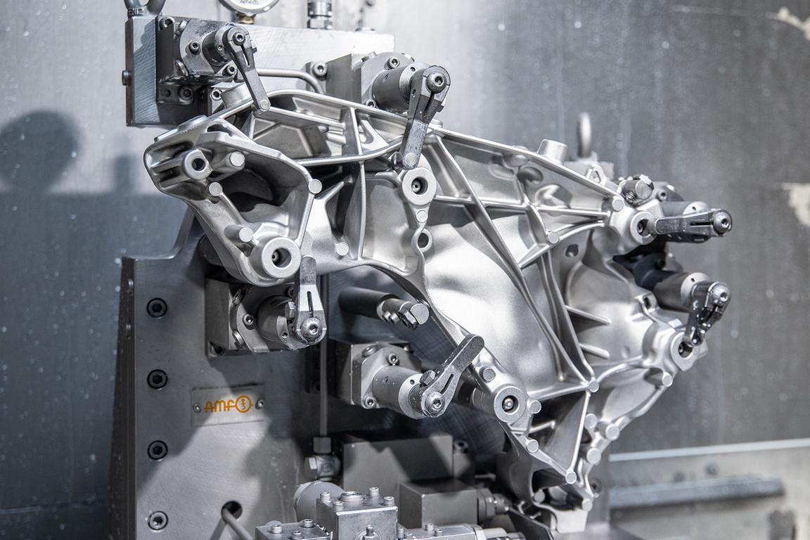 Wichtig ist, dass die Spannhydraulik sich an die Bauteile anpasst und nicht umgekehrt. So hat AMF beispielsweise für einen Kunden flexible Aufspannvorrichtungen für vier Varianten von Bauteilen gefertigt, die paarweise aufgespannt und bearbeitet werden. Für die Fixierung großer Gussteile sorgt eine Kombination aus hydraulischen Niederzugspannern und anschwimmenden Unterstützungselementen. Das gewährleistet eine perfekte Ebenheit der Teile. Um 180° gewendet, nehmen Nullpunktspannmodule eingeschraubte Spannbolzen auf und fixieren die Bauteile direkt, verzugsfrei und rundum zugänglich für eine Fünfseitenbearbeitung.