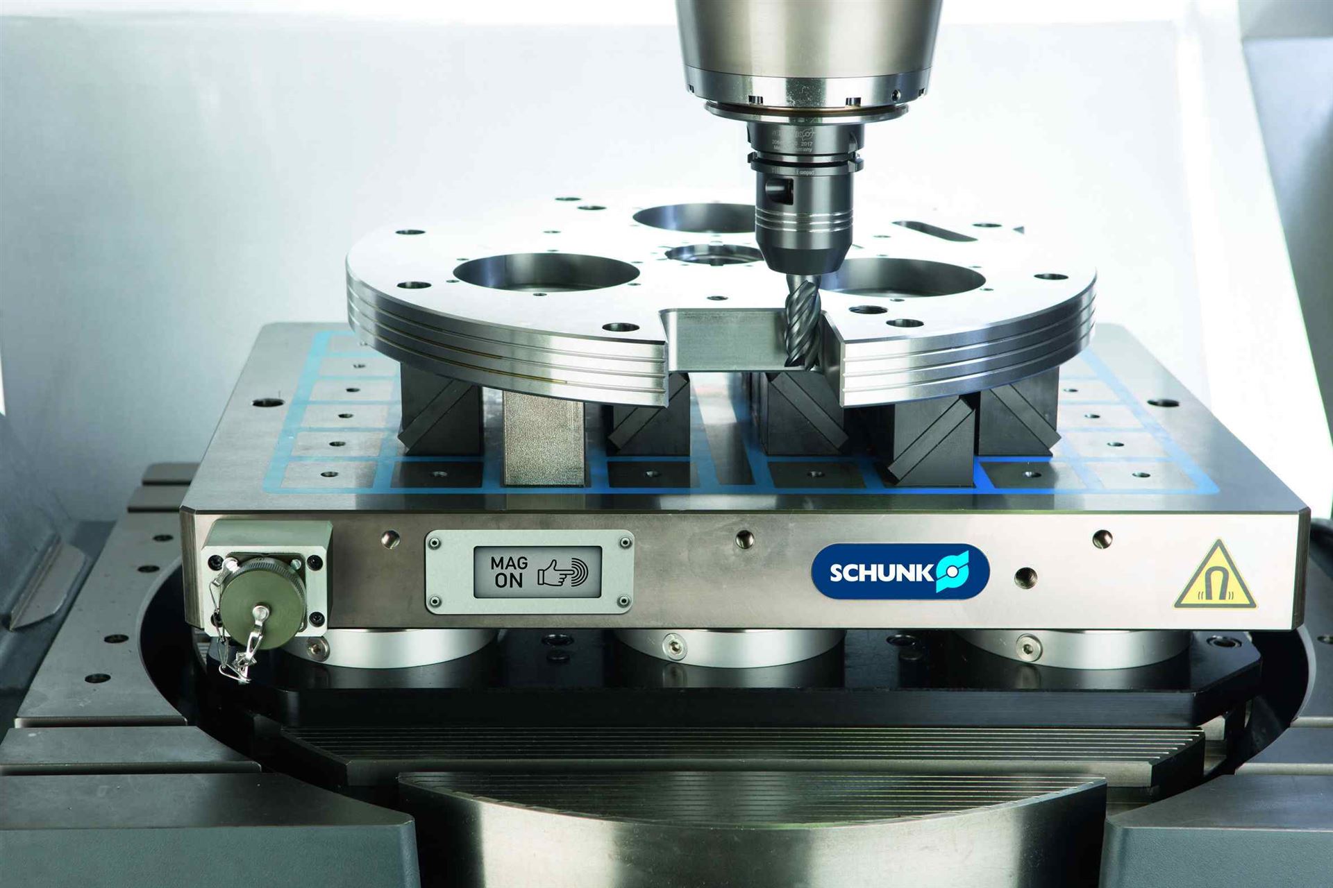 Seit Jahren stehen die MAGNOS-Magnetspannplatten von SCHUNK für energieeffizientes und zuverlässiges Spannen von ferromagnetischen Werkstücken. Die Werkstückspannung mit Magnetspanntechnik überzeugt nicht nur durch hohe Haltekräfte, sie ist auch die ideale Spannlösung für Fräsanwendungen mit 5-seitiger Werkstückbearbeitung in einer Aufspannung. Die Elektropermanent-Technologie garantiert eine gleichmäßige Magnetspannkraft über das gesamte Werkstück, wodurch auch komplexe Zerspanaufgaben möglich sind. Hierbei benötigen die Platten nur einen kurzen elektrischen Impuls für die Magnetisierung beziehungsweise Demagnetisierung, was zu energieschonenden Bearbeitungsprozessen beiträgt.